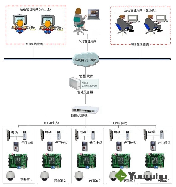 (一)术语 管理服务器系统业务主要逻辑处理,包括前台系统管理软件及数据库。远程管理终端学生或教师登陆系统服务器所用终端,可进行网络实验室预约、审批及查看等业务。本地管理终端值班老师登陆系统服务器所...